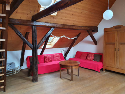Im Wohnbereich des Dachgeschosses können zudem zwei bequeme Sofas mit einem einfachen Handgriff zu zwei weiteren geräumigen Betten umgebaut werden.